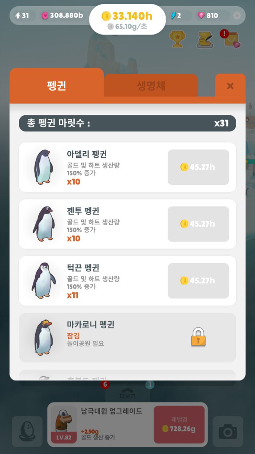 펭귄의 섬은 아래쪽 중간에 있는 레벨업 버튼을 누르면 가진 돈에 맞게 알아서 시설 업그레이드를 합니다.