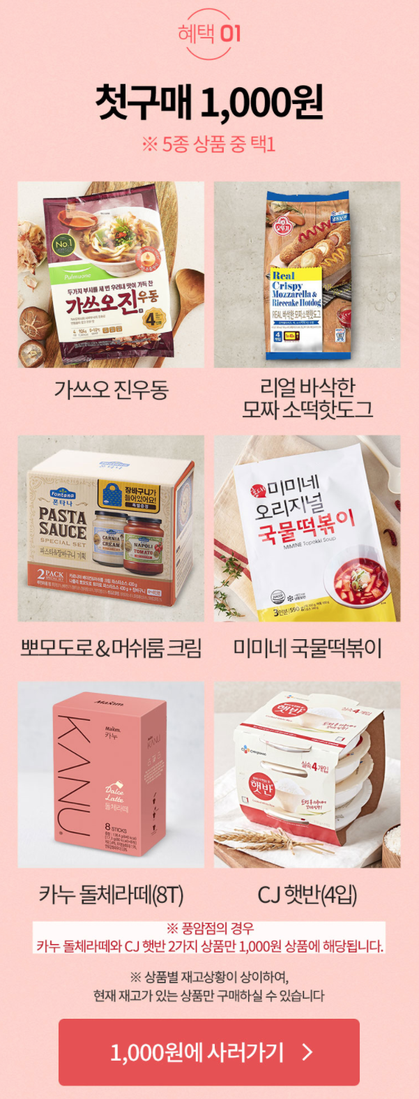 롯데슈퍼는 아래 5종 상품 중 한 상품에 한해 1,000원에 구매할 수 있고, 3만원 이상 구매 시 1만원 쿠폰을 사용할 수 있습니다.