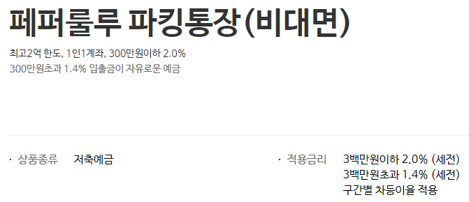 - 페퍼룰루 파킹통장은 300만원 이하 2.0% 입니다.