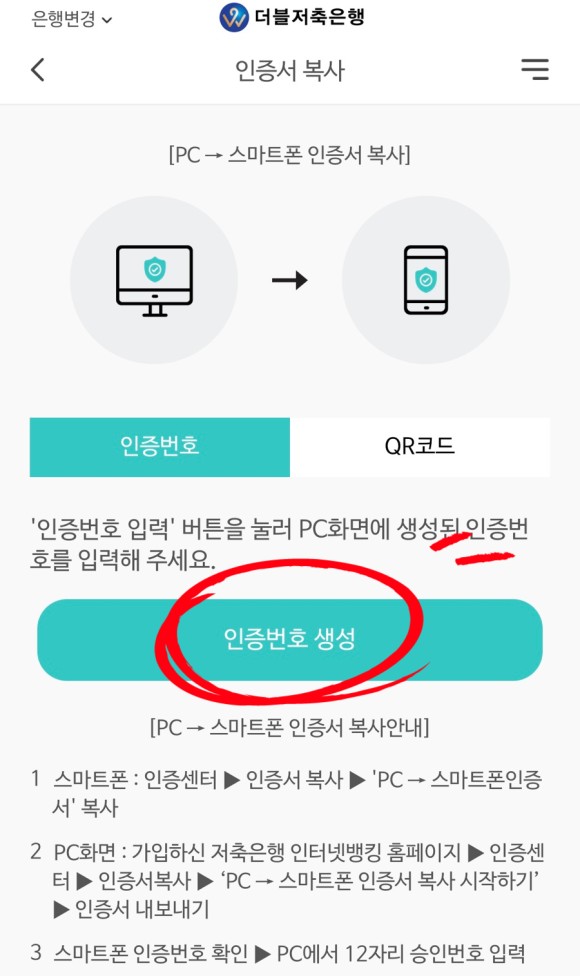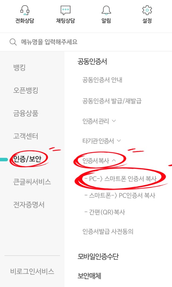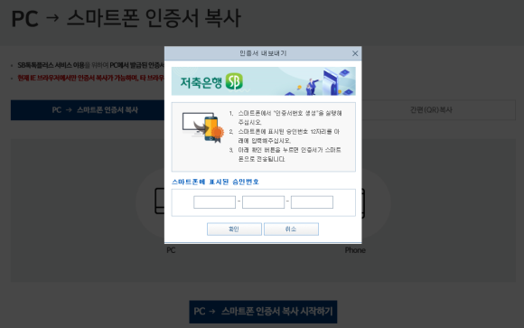 - SB톡톡+ 앱) 인증/보안 > 인증서복사 > PC -> 스마트폰 인증서 복사 > 인증번호 생성