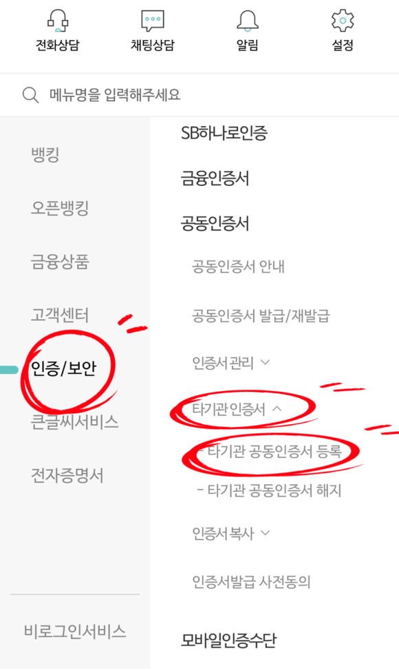 - SB톡톡+ 앱) 인증/보안 > 타기관 인증서 > 타기관 공동인증서 등록